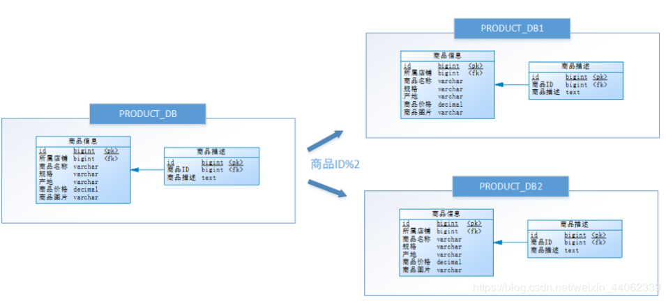 由于商品信息与商品描述业务耦合度较高,因此一起被存放在PRODUCT_DB(商品库);而店铺信息相对独立,因此单独被存放在STORE_DB(店铺库)。